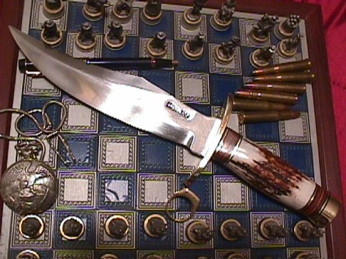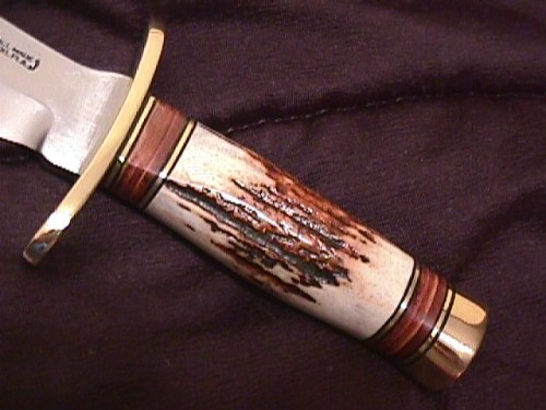 This was a re-handle job on a big bear Randall Blade done in a trapper Handle as the per the customer wanted. Also See Sheaths and Holsters. |